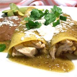 5.Soak three tortillas in the sauce, one at a time, for a few seconds, fill them with shredded chicken, sprinkle the meat with some of the sauce, roll them and place them seam side down on a pasta bowl. Spoon a generous amount of sauce over them and top them with lettuce, cilantro, crema, and cotija cheese. Pour a little more sauce over the whole thing if desired. Repeat the procedure twice more. Serve immediately.