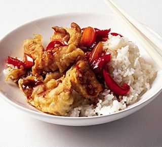 2. Heat the groundnut oil in a deep-fat fryer to about 180C. Then dip a few chunks of chicken at a time into the batter, then place in the hot oil using tongs or a slotted spoon, but don’t crowd the pan. Fry until crisp and golden – about 2 mins. You may need to do this in batches, so reheat the oil each time. As the chunks cook, lift out with tongs/spoon to the paper-lined plate to drain.