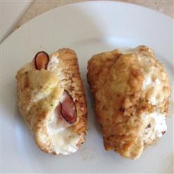 Pound chicken breasts if they are too thick. Place a cheese and ham slice on each breast within 1/2 inch of the edges. Fold the edges of the chicken over the filling, and secure with toothpicks. Mix the flour and paprika in a small bowl, and coat the chicken pieces.