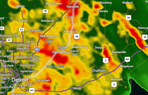 An early fall type of low pressure system northern lower Michigan will track northeastward across Northern Lake Huron tonight then into Northeastern Ontario and Quebec by Thursday morning. This moisture laden low will drag a fairly sharp cold front across the regions tonight. Most regions will receive total rainfall amounts of 20 to 40 mm. However a few thunderstorms with very heavy downpours and gusty winds will be possible tonight resulting in local rainfall amounts near 50 mm. A Canwarn trained spotter measured about 75 mm of rain near Belle River in Essex County late Wednesday afternoon. A few wind gusts of 75 to 85 km/h are not out of the question over Southwestern Ontario this evening.