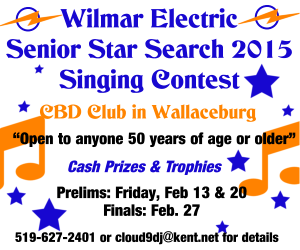 With the Wimar Electric Senior Star Search 2015 Singing Contest.Last preliminary is TONIGHT with the finals Feb 27th. No entry fee. If you don’t sing, come watch – it is great entertainment.