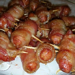2. Cut bacon into thirds and wrap each strip around a little sausage. Place the wrapped sausages on wooden skewers, several to a skewer. Arrange the skewers on a baking sheet and sprinkle them liberally with brown sugar.