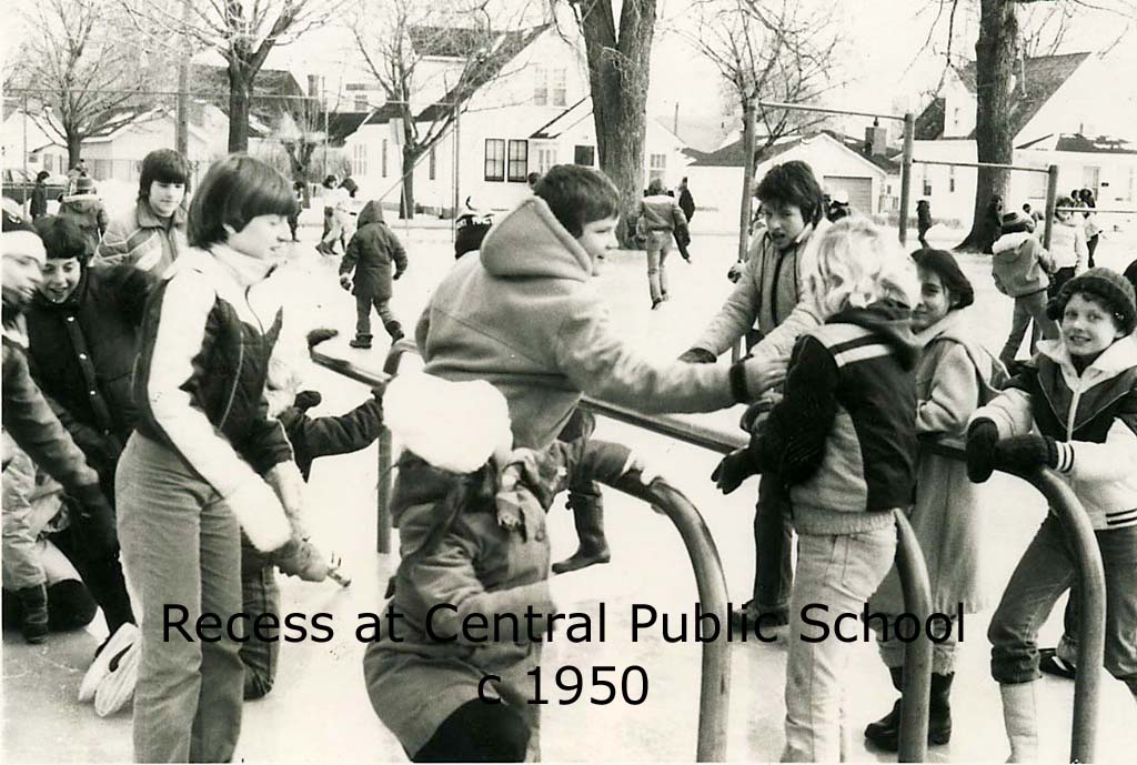 Here is a photo of the recess time at Public Central School in Wallaceburg from way back in 1950.