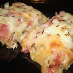 4. Arrange corned beef over the cheese, then drizzle with the remaining salad dressing. Top with sauerkraut and remaining Swiss cheese. Sprinkle with caraway seed.