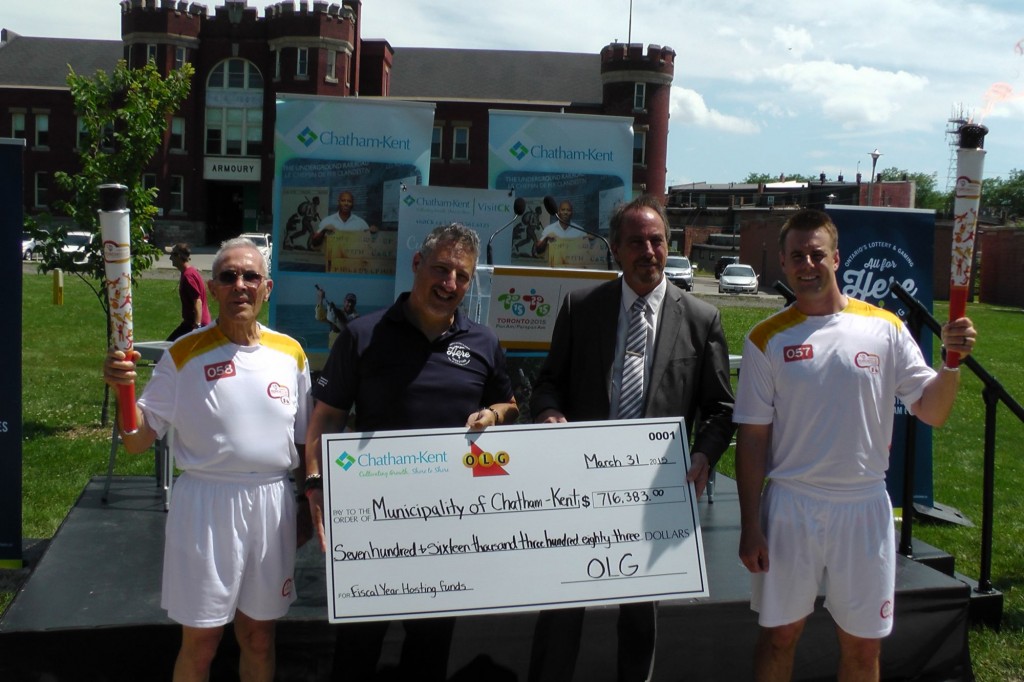 Submitted photo: Left to right: Pan Am Torchbearer Pearce Plato, OLG Director of Municipal and Community Relations Jake Pastore, Chatham-Kent Mayor Randy Hope, and Pan Am Torchbearer Mark Eastcott at the ceremonial cheque presentation. As OLG is a presenting sponsor of the TORONTO 2015 Pan Am Games Torch Relay, the presentation was held in Tecumseh Park, Chatham, concurrent with activities of the Torch Relay community celebration.