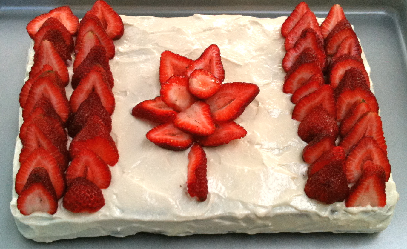 7. Add 2-3 rows of overlapping strawberries for the two red stripes in the Canada flag. For the center, trace out a maple leaf shape. Use the points of the strawberries for the points in the maple leaf. Cut strips of strawberry for the leaf stem and continue filling in the maple leaf with sliced strawberries.