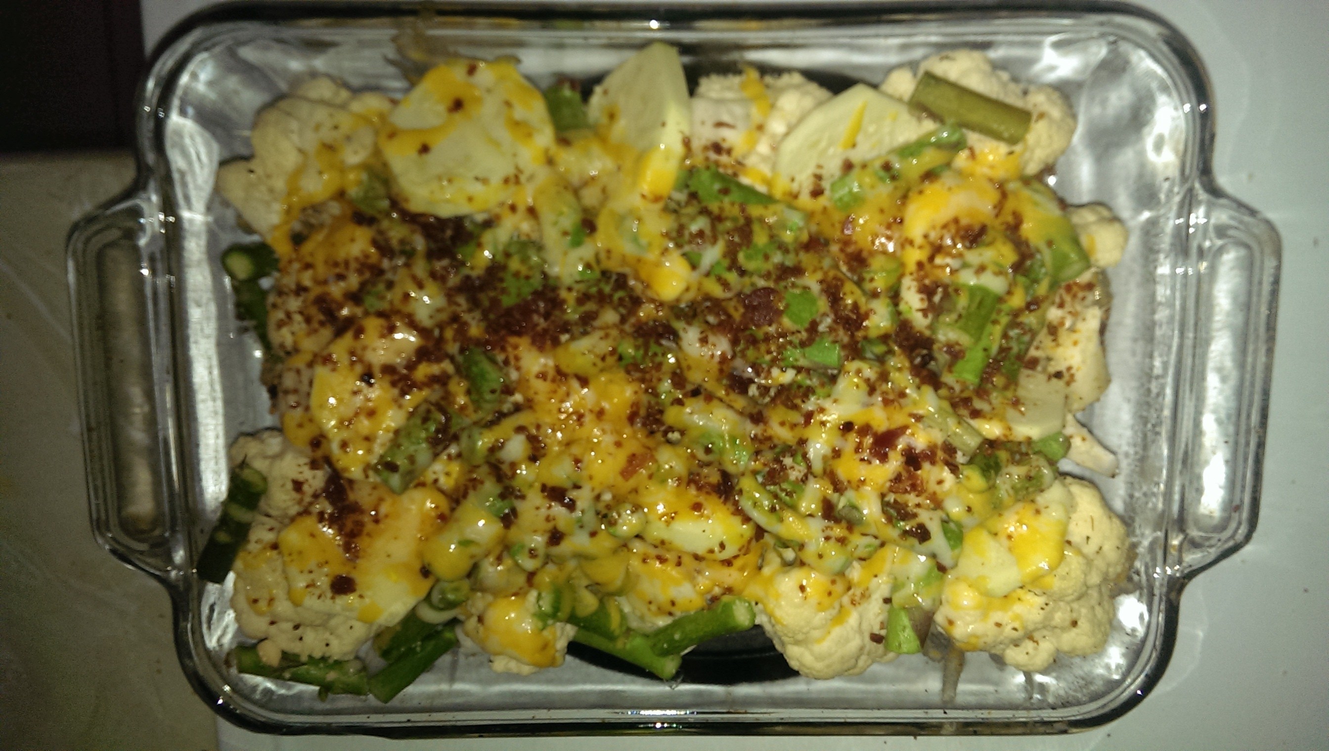 2. Mix cauliflower with sour cream, cheddar cheese, crumbs, pepper, onions, and salt.Put in greased 2qt casserole.Sprinkle with parmesan and bacon bits.