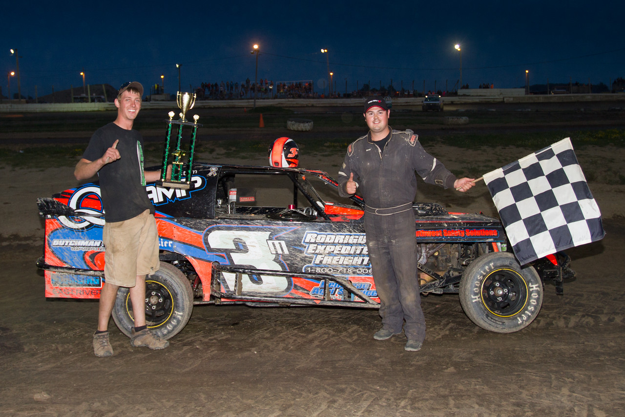 Submitted photo: Matt Sorrell, right, holds the checkered flag with his brother Marshall Hereygers, left, holds the Tirecraft Mini-Mods mid-season championship trophy. The half-brothers share the No. 3M ride.