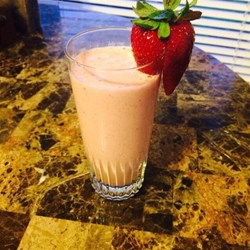 1. In a blender, combine soy milk, oats, banana and strawberries. Add vanilla and sugar if desired.