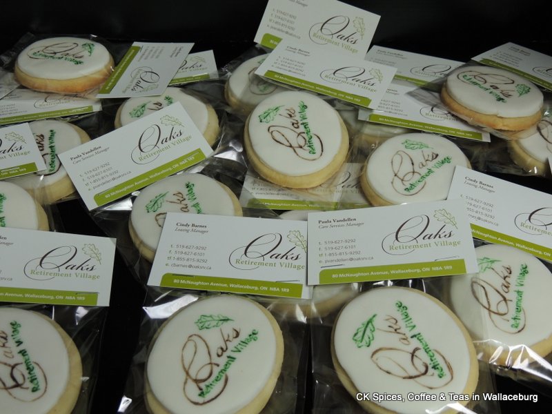 Corporate treats can be individually wrapped. We can put your Logo or any message on the cookies. We can also add them to Gift Baskets or Gift Mugs. The custom sugar cookies pictured to the left were ordered by Oaks Retirement Village in Wallaceburg. CK Spices, Coffee & Teas thanks them for shopping local and supporting local businesses!