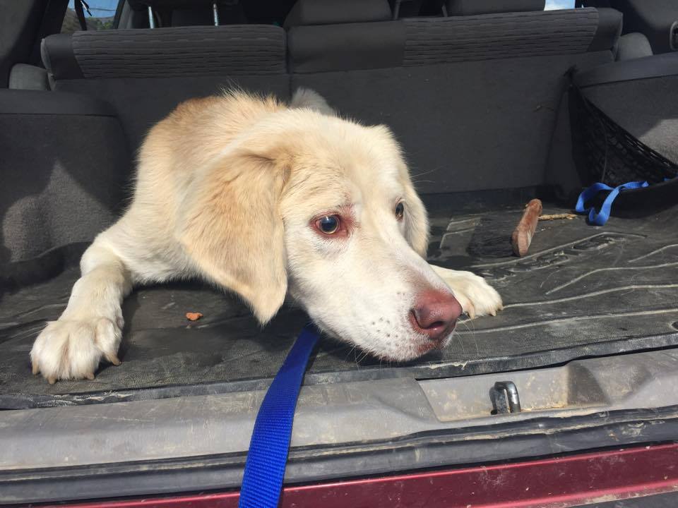P.A.W.R received a call from a property owner whose tenant had been evicted. When they went to assess the condition of the house they decided to check the barn as well. What they found left them shocked and heart broken. A large white dog, locked up in the almost completely dark barn, starving, terrified, dirty and flea covered.