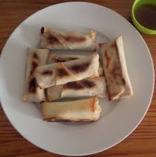 7. Roll it up tightly, making sure there isn’t much air. Brush some of your egg mixture on the last little flap and seal. Do this until all your rice paper is gone. Should make at least 4 rolls.