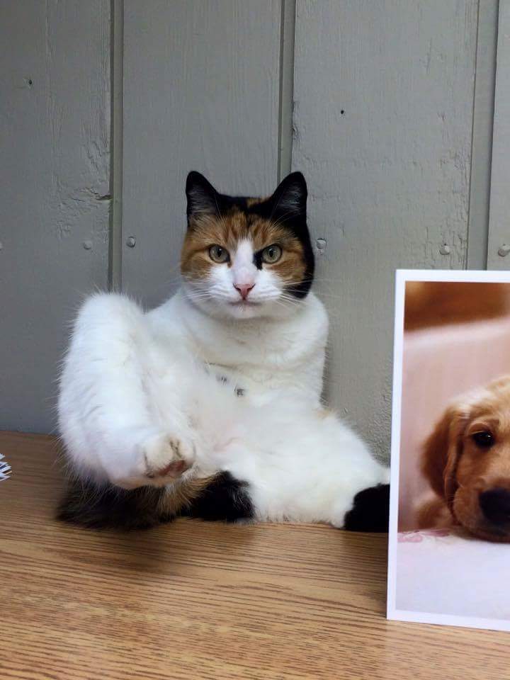 She is very recognizable as she has no tail. She is a small calico cat and is also microchipped.