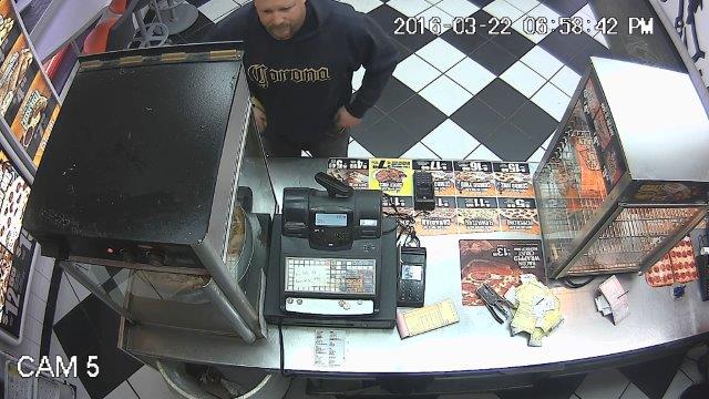 Police officials say on March 22, around 7 p.m. a man (pictured) entered Little Caesars Pizza on St. Clair Street and stole a full bottle of garlic butter valued at about $25.