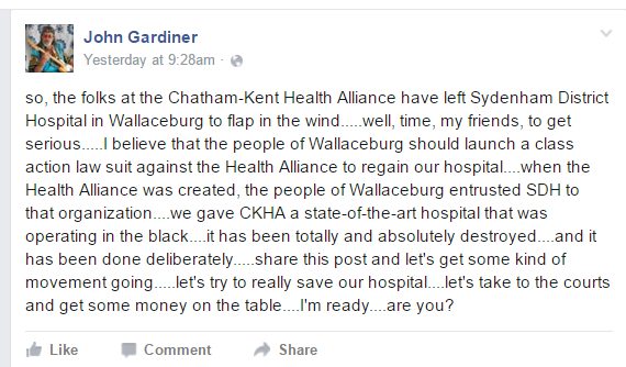 “I believe that the people of Wallaceburg should launch a class action law suit against the Health Alliance to regain our hospital,” Gardiner posted.