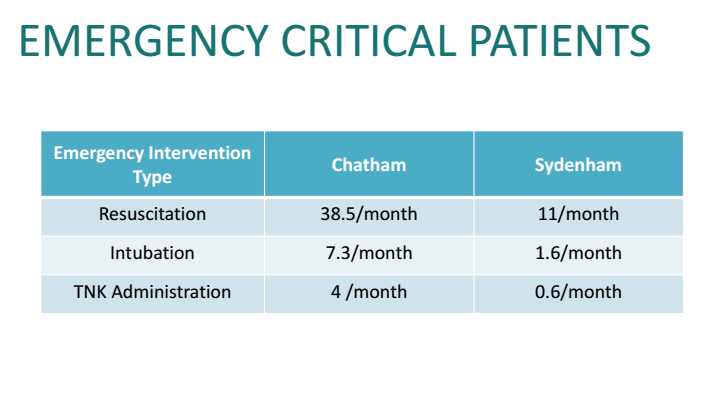 – In Chatham about 4 TNK administrations (medicine given to severe heart attack patients) per month are done while 0.6 a month are done at Sydenham Campus.