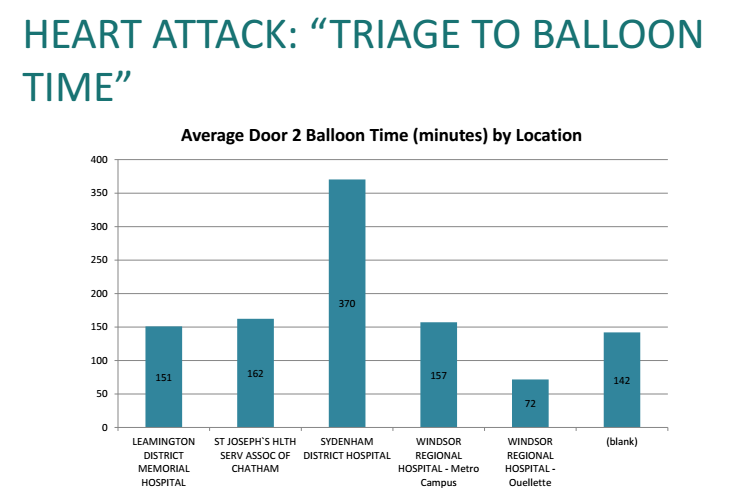Referring to “preliminary data” from October to December of 2015, Dr. Ghosh said from the time a patient saw the triage nurse, to the time a balloon is inserted at the cath lab in Windsor – it took 162 minutes on average when coming from the Chatham campus, compared to 370 minutes from the Sydenham Campus.