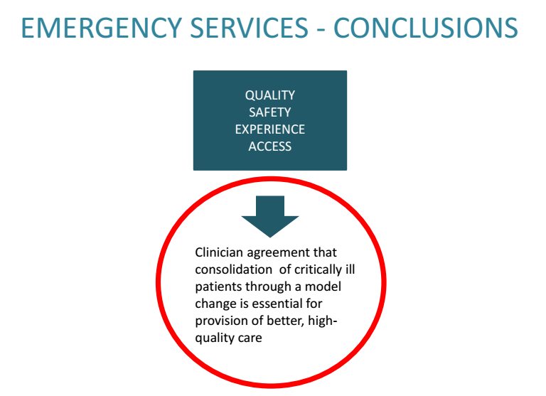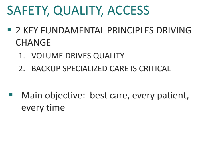 “To personalize it, if it is your family member who is critically ill, do you want to go to a place that does 40 resuscitations a month, or 11? Do you want to go to a place that intubates 7.5 a month, or 1.5? The cost is an extra 25 minutes drive. It’s important to think about this from the context of best care, every patient, every time.”