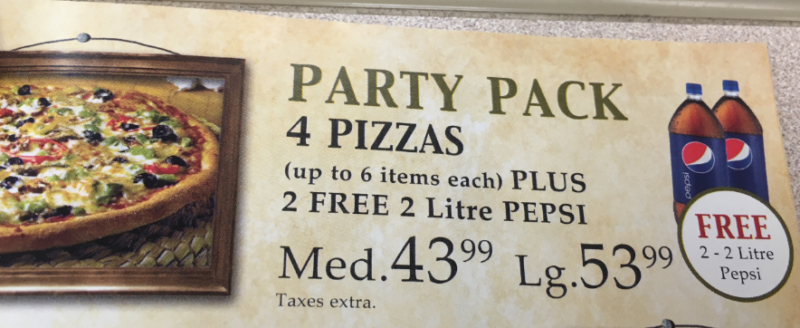Entertaining and don’t want to cook? Order our Party Pack! 4 pizzas up to 6 toppings each plus 2 free 2L pepsi products. Med $43.99 Lg $53.99. Call (519) 683-4633 Open 11am – 11pm.