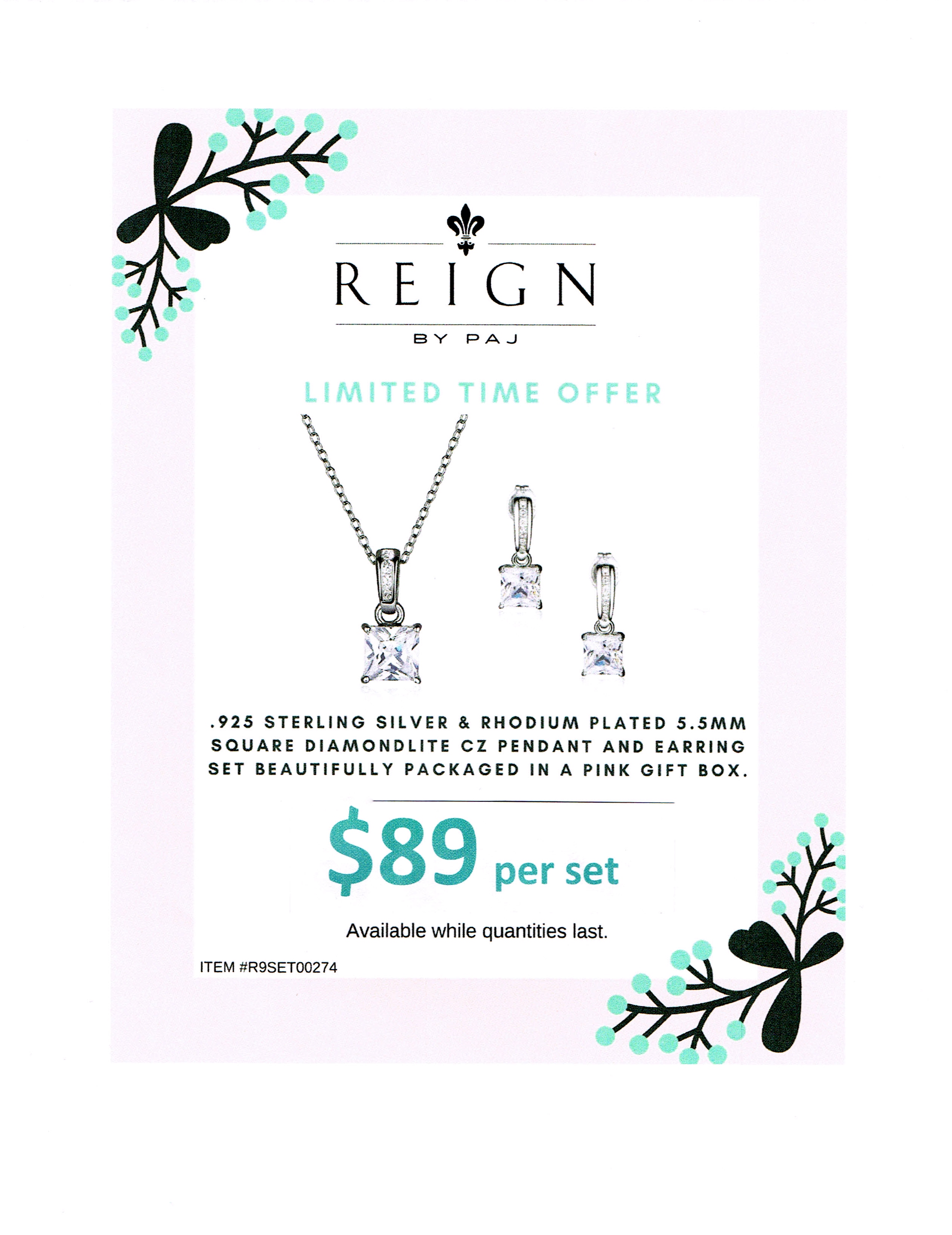 Babcock Jewellers has a limited edition collection of sterling silver “Reign” cubic zirconia sets – on for only $89 per set while they last!