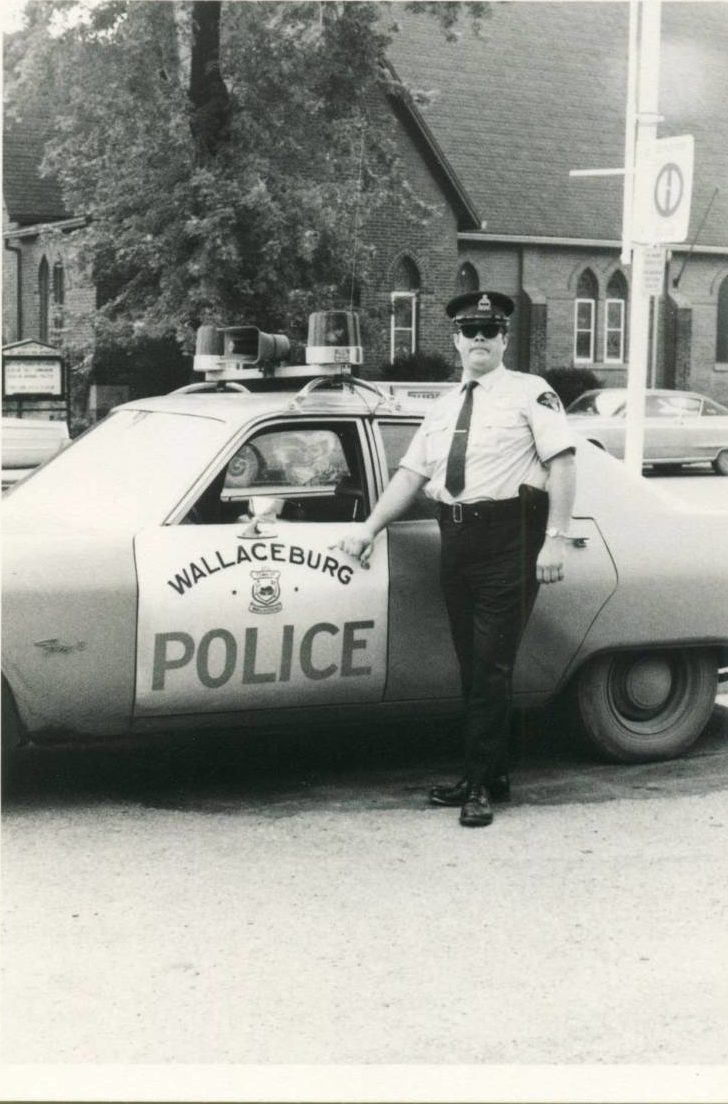 Here is an photograph of officer Mike McNaughton with a Wallaceburg police cruiser in 1973.