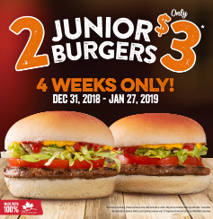 That’s right! No coupon necessary. Special runs until January 27th 2019! Bacon and cheese is extra. Taxes Extra. Not valid with a combo. May not be combined with any other offer.