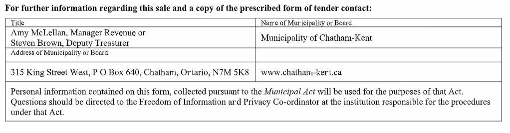 A copy of the prescribed form of tender is on the Municipality of Chatham Kent website, www.chatham-kent.ca and on the website of the Government of Ontario Central Forms Repository under the listing for the Ministry of Municipal Affairs.