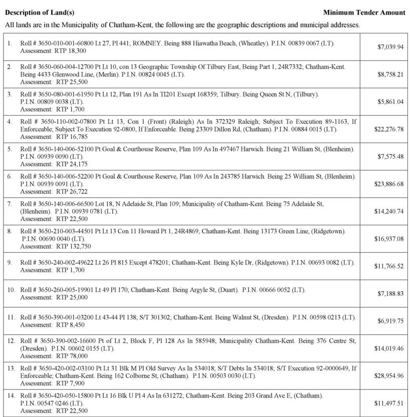 Take Notice that tenders are invited for the purchase of the land(s) described below and will be received until 3:00 p.m. local time on September 5th , 2019, at the Municipality of Chatham-Kent, Civic Centre, 315 King Street West, Chatham, Ontario, N7M 5K8.