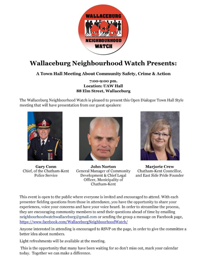 The Wallaceburg Neighbourhood Watch Steering Committee has listened to the concerns from the public and are organizing a Town Hall style event, to ensure everyone has their voices heard.