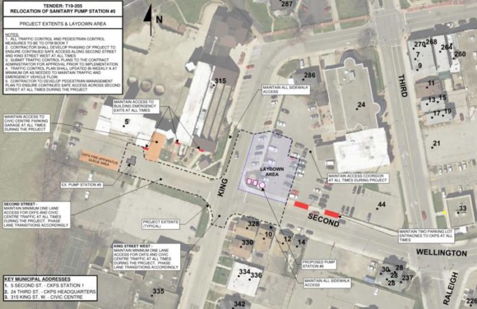 Seven municipal parking spaces along King Street West will be allocated to the contractor as part of their Laydown Area. In addition, the sidewalk at the east corner of King and Second Street will be closed.