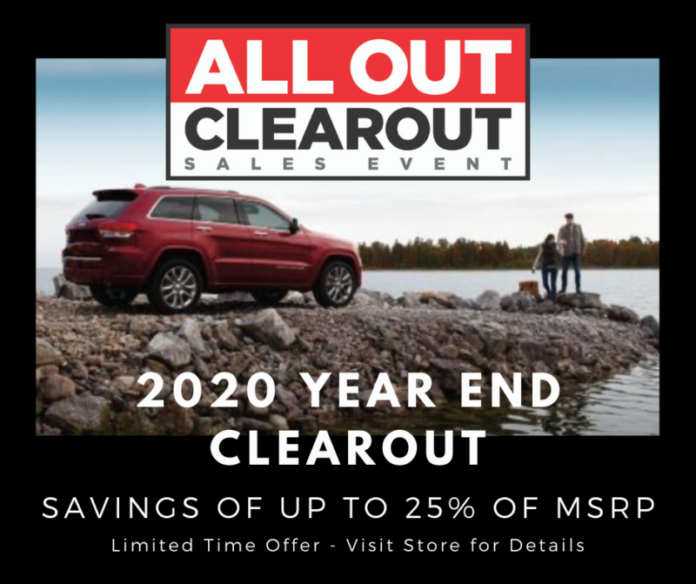 The ALL OUT CLEAROUT is happening now at Patterson Motors! Just a few of our amazing deals include HUGE MSRP discounts, OR choose 0% Financing.✔️ 2020 Dodge Grand Caravan – Save 25% of MSRP✔️ 2020 Ram 1500 Classic – Save 25% of MSRP✔️ 2020 Jeep Grand Cherokee – Save 15% of MSRP✔️ 2020 Dodge Durango – Save 15% of MSRP✔️ 2020 Chrysler Pacifica – Save up to 15% of MSRP✔️ 2020 Jeep Wrangler – Save 10% of MSRP✔️ 2020 Jeep Cherokee – Save 10% of MSRP✔️ 2020 Jeep Gladiator – Save 5% of MSRP✔️ 2020 Ram 1500 DT – First 3 Payments Are On Us – up to $750 per month PLUS 0% financing up to 96 months. ✔️ 2020 Jeep Cherokee, Compass and Renegade – Save an additional $750 in Jeep Bonus Cash on most models.View inventory at www.pattersonchrysler.caOffers end September 30th. Visit store for details.