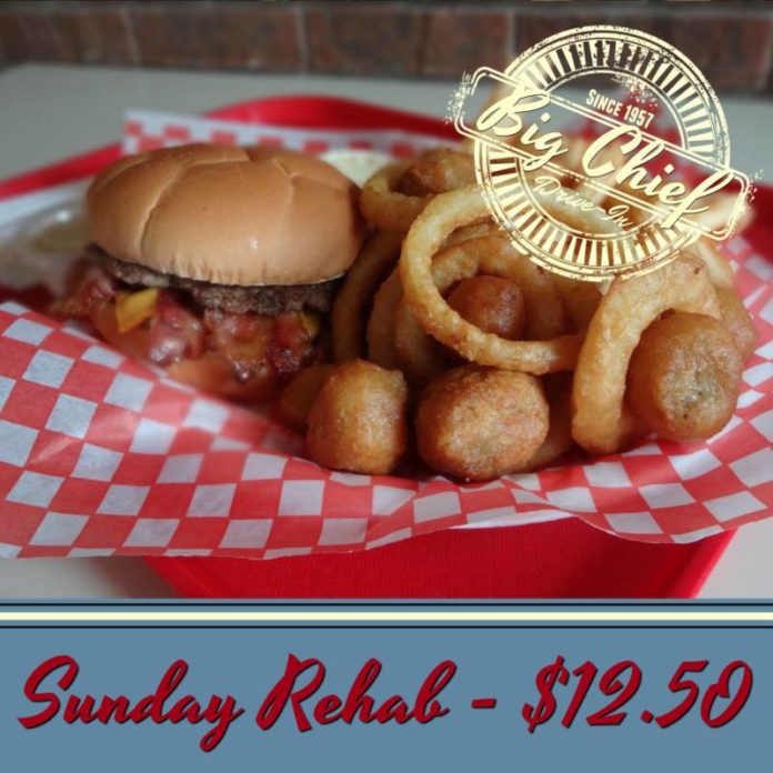 Hey, folks! We’ll be flipping burgers from 11am until 8pm. If you’re not into cooking your own big meal on Sunday, bring the fam to The Chief. We’d be happy to sell you our Rehab Platter for $12.50. Come and sample all the things! ![]()