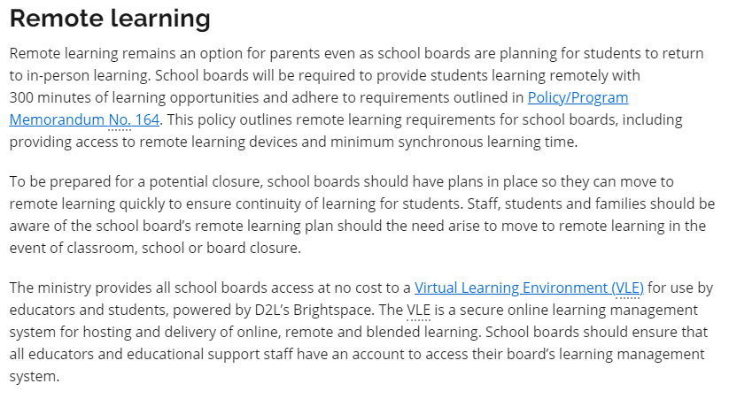 “For the 2021-22 school year, the Ministry of Education will continue to focus on supporting the health, safety and well-being of students, families and staff. Based on advice from the Chief Medical Officer of Health, schools are permitted to open for in-person learning with health and safety measures in place for the 2021-22 school year.”