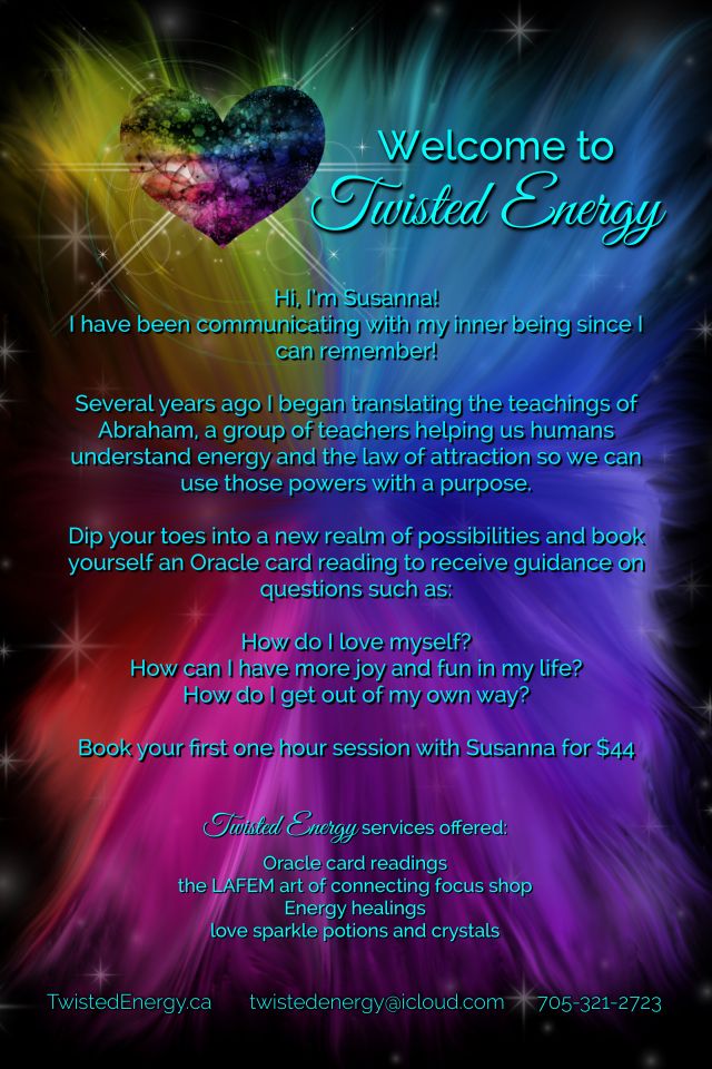 “Several years ago I began translating the teachings of Abraham, a group of teachers helping us humans understand energy and the law of attraction so we can use those powers with a purpose.” Services include: Oracle card readings LAFEM Art of Connecting Focus Shop Energy Healings and more.