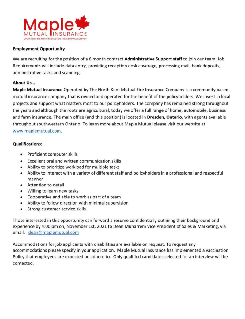 We’re Hiring! 👋 Maple Mutual Insurance is looking to recruit for a 6-month contract position to join our Administrative Support Team. To apply, please review the memo below and submit your application by 4:00pm on November 1st, 2021.