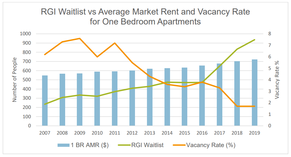 The graph below shows a comparison of the RGI waitlist versus the average market rent and vacancy rate between 2007-