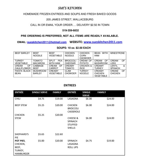 Due to the current lockdown, the restaurant will be closed until further notice. We will be on location Monday, Wednesday and Friday mornings from 8-12pm to receive and fill frozen food/baked goods orders only. If you would like to place an order please call 519-359-6832 or email sueskitchen2011@hotmail.com
