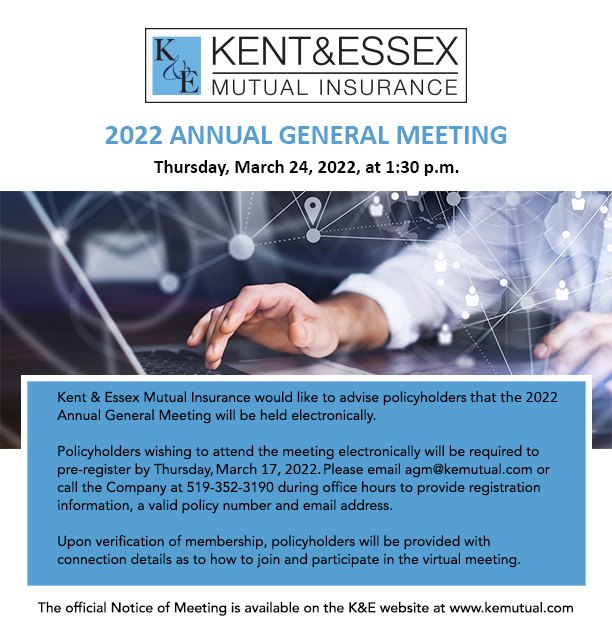 The Kent & Essex Mutual AGM is being held electronically. Policyholders wishing to attend must pre-register by March 17, 2022. The official Notice of Meeting is available at www.kemutual.com