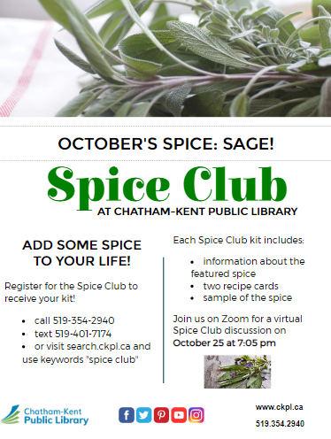 Add some spice to your life! Register for the Spice Club to receive your kit! Call 519-354-2940, text 519-401-7174 or send us a Facebook message to register. Each Spice Club kit includes information about the featured spice, two recipe cards and a sample of the spice. Join us on Zoom for a virtual Spice Club discussion on October 25 at 7:05 pm