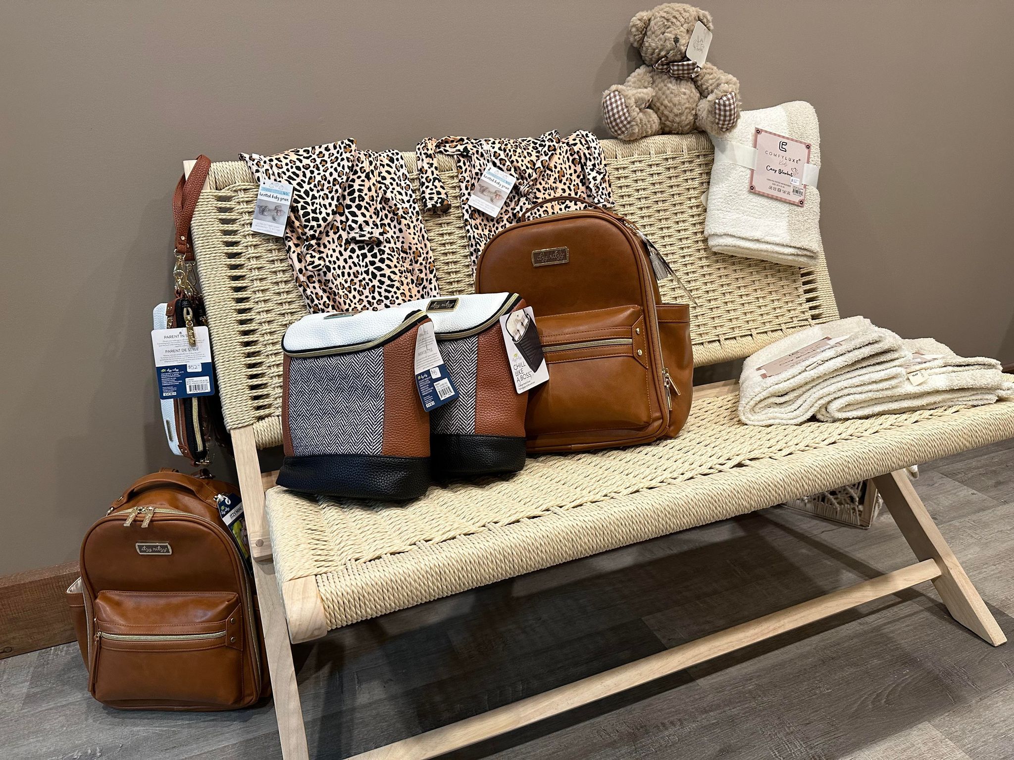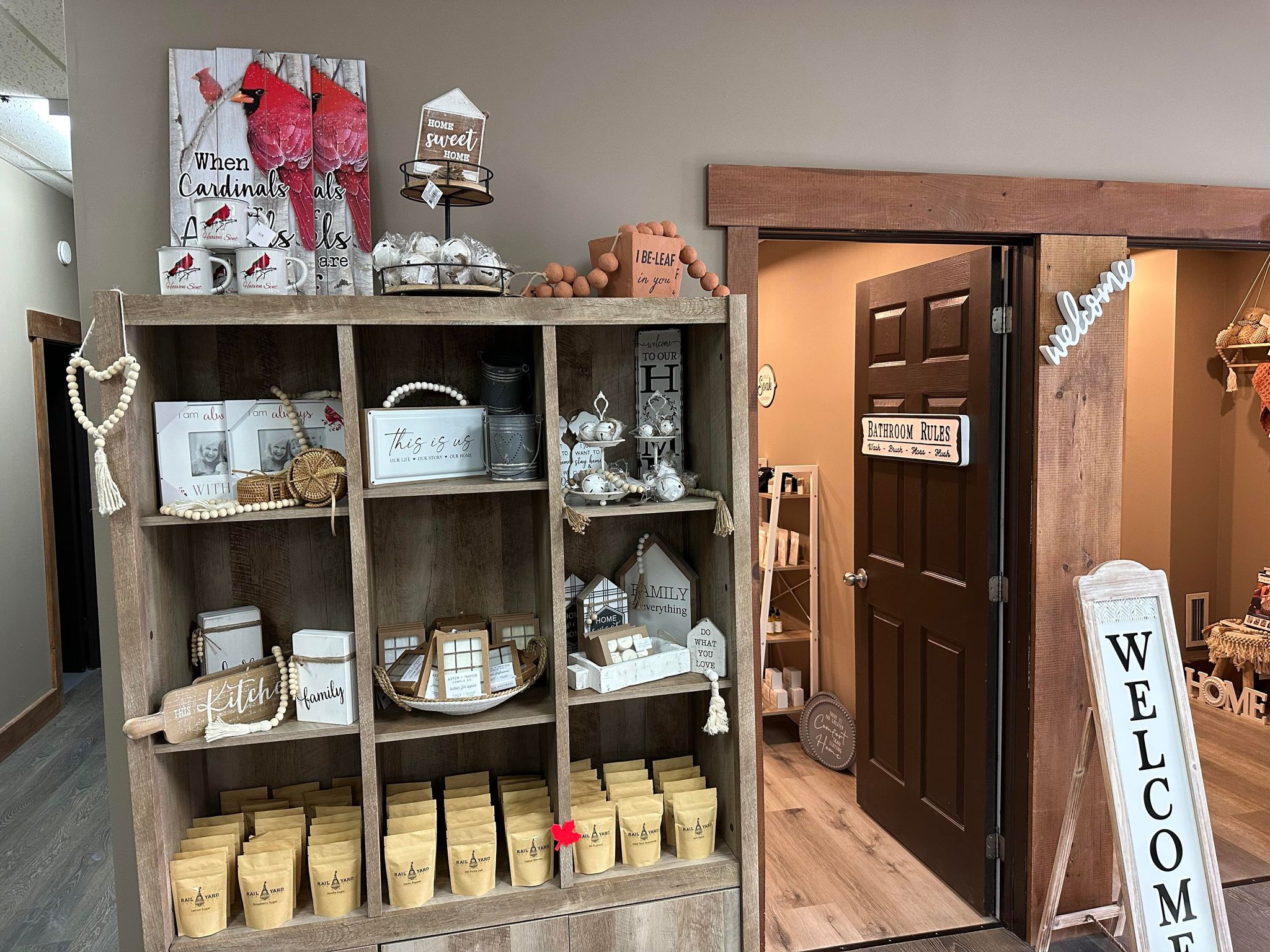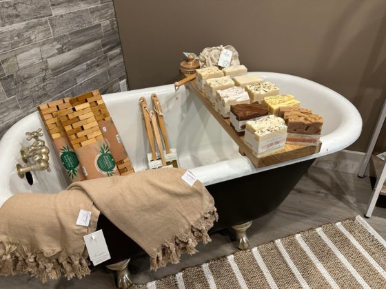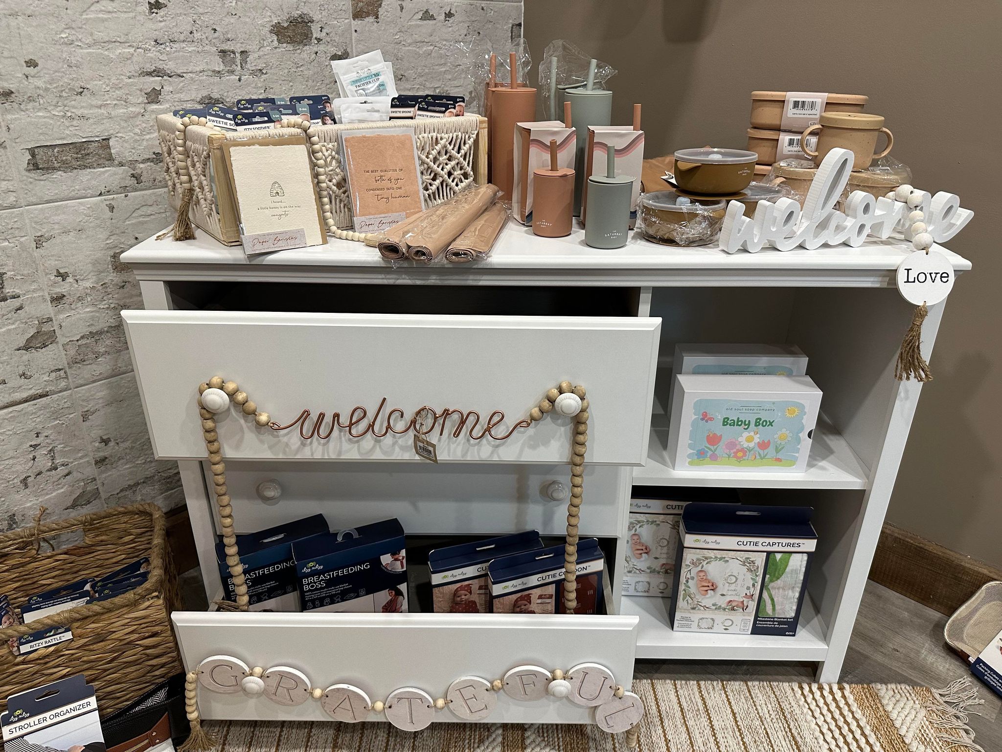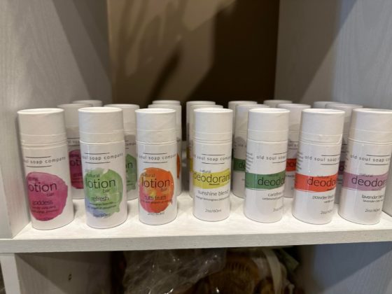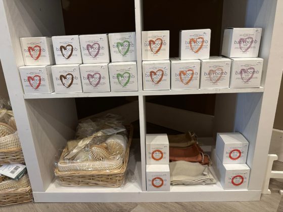 There is also a room dedicated to baby items, including onesies, blankets, and toys, as well as a room filled with body care products such as natural deodorants, skin care, bath bombs, and accessories.