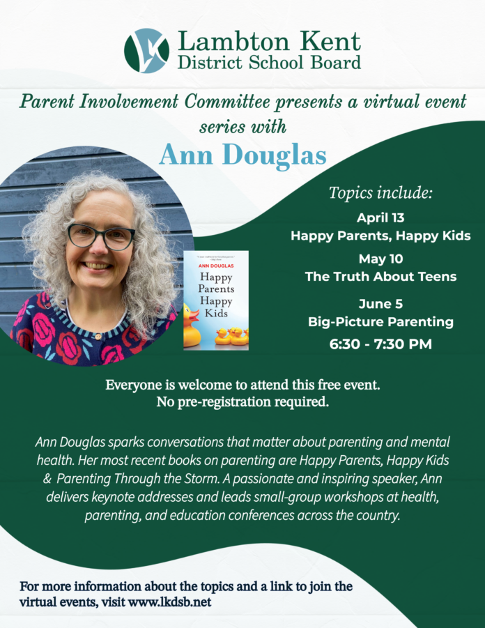 The Lambton Kent District School Board’s (LKDSB) Parent Involvement Committee is hosting a monthly virtual event series April to June for parents/guardians and community members featuring Ann Douglas, author of Happy Parents, Happy Kids and Parenting Through the Storm.