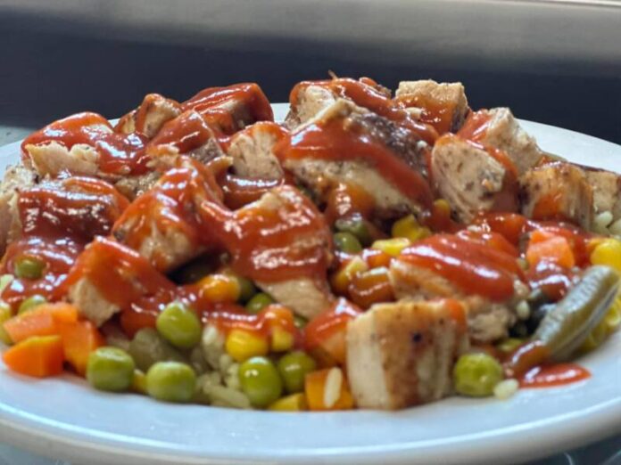 BBQ Chicken Rice Bowl, seasoned rice, mixed vegetables, grilled chicken and BBQ sauce, w/soup or side salad. 519-683-4371.