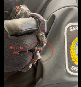 He emerged from behind the door holding a machete and what appeared to be a handgun was observed at this feet. Failing to comply with officer’s direction, police discharged a service issued conducted energy weapon (CEW), which temporarily incapacitated him.