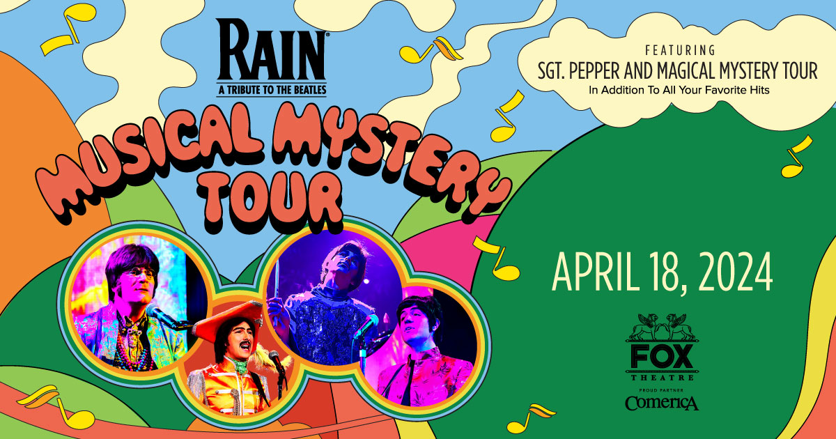 RAIN: A Tribute to the Beatles is an electrifying concert experience celebrating the timeless music of the legendary fab four. With note-for-note precision, this mind-blowing performance transports you back to the iconic eras of Sgt. Pepper and Magical Mystery Tour, along with all your favorite hits. From energetic classics to reflective favorites, the band delivers an unforgettable performance that appeals to fans old and new. With vibrant costumes and psychedelic visuals, RAIN creates a stunning concert full of nostalgia and good vibes. RAIN – A Tribute to the Beatles promises an extraordinary journey through the eras that captivates hearts and inspires all generations. Coming to the Fox Theatre April 18! Get tickets now at 313presents.com and Ticketmaster! Comerica Bank is the exclusive presenting partner of the Fox Theatre.