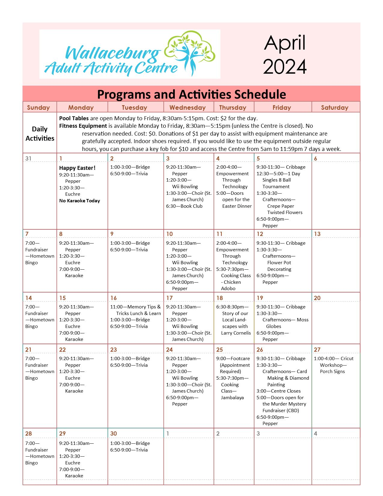 News April 5, 2024 April 2024 calendar at the Wallaceburg Adult Activity Centre Here are the activities, programs and events planned at the Wallaceburg Adult Activity Centre for the month of April, 2024: Previous articleCouch to 5k program in Wallaceburg starting in AprilNext article1-on-1 with NHL goalie mask artist Greg Harrison, the head speaker at the 2024 Wallaceburg Sports Hall of Fame Awards Banquet - Advertisment -