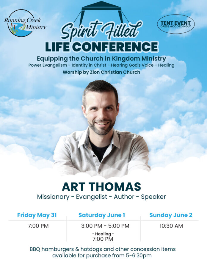 Join us for the spirit filled life conference, which is a tent event so dress accordingly on Friday, May 31, Saturday, June 1, and Sunday, June 2. Equipping the church in kingdom, ministry power, evangelism, identity in Christ, hearing God‘s voice, healing. Worship will be by Zion Christian Church, special guest Art Thomas – a missionary, evangelist, author and speaker will be at 29292 Running Creek Rd. Wallaceburg. There will also be barbecued hamburgers, hotdogs and other concession items available for purchase. Contact us at 519-328-5672 or email runningcreekministry@gmail.com