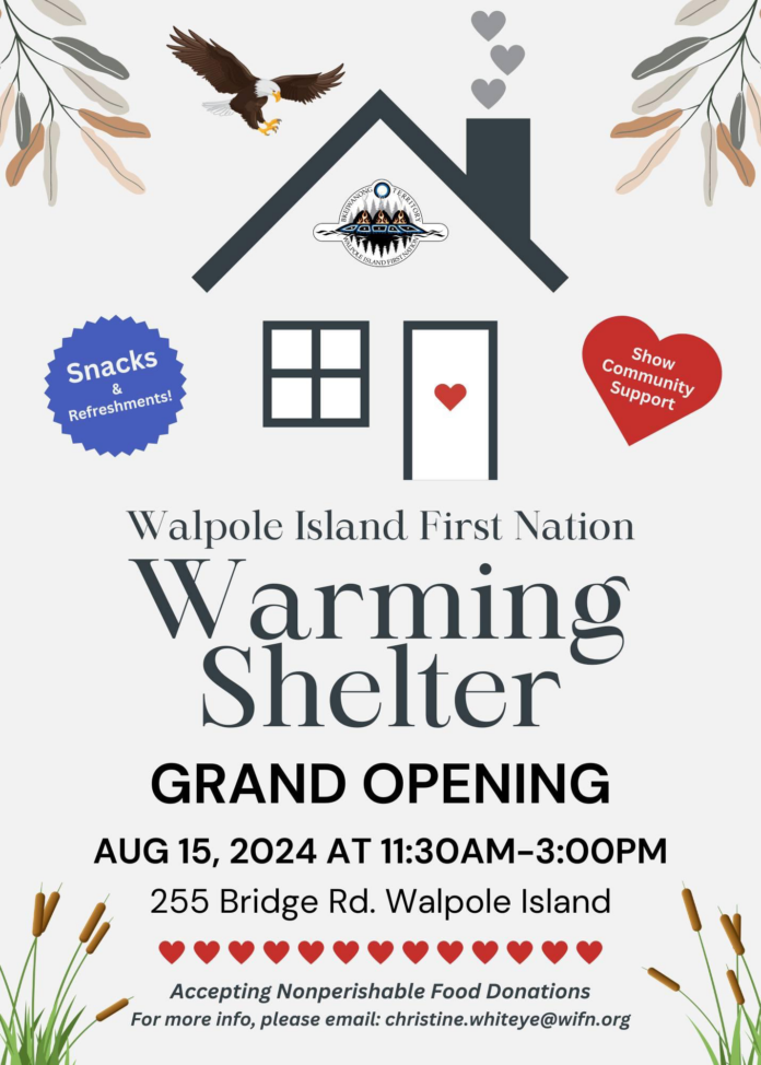 “We are proud to announce the Grand Opening of the Walpole Island First Nation Warming Shelter (255 Bridge Rd. Walpole Island) on August 15, 2024 at 11:30 a.m. to 3 p.m.,” organizers say.