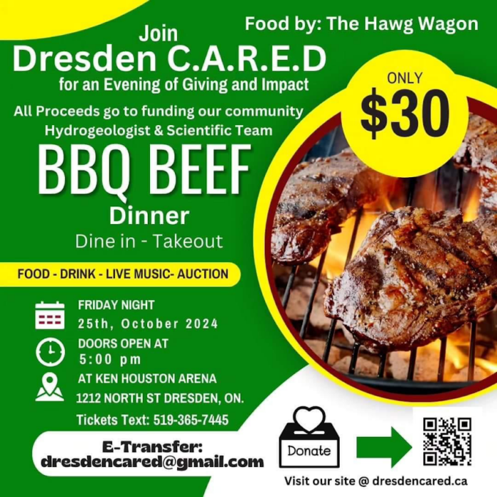 News September 7, 2024 Tickets available for Dresden C.A.R.E.D. barbecue dinner Tickets are available for an upcoming Dresden C.A.R.E.D. barbecue dinner, taking place on October 25, 2024 at Ken Houston Memorial Arena. Details are listed on the poster above. Previous articlePortion of All Seasons fall decor proceeds going to Christ The King, September 9-14Next articleCat found just outside of Dresden - Advertisment -
