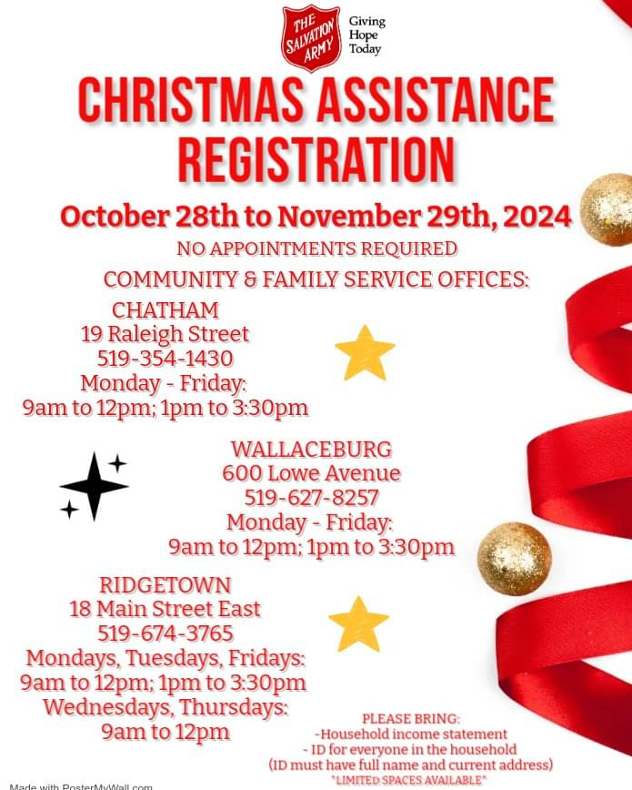 No appointments are required for registration, which will be conducted at Community and Family Service offices in Chatham, Wallaceburg, and Ridgetown.