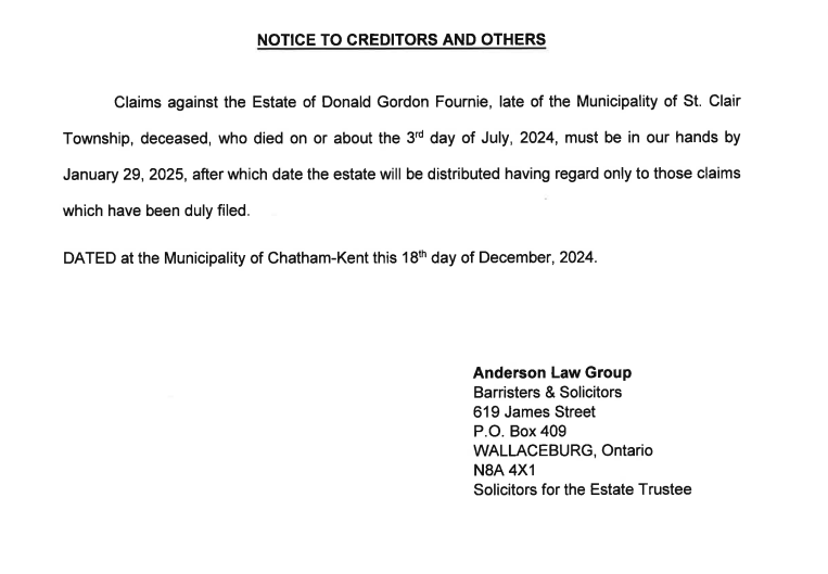 BusinessNews December 20, 2024 Notice to Creditors for the Estate of Donald Gordon Fournie Anderson Law Group has provided the following Notice to Creditors for the Estate of Donald Gordon Fournie, File No.: 26623: – This story is sponsored content. Previous articleCKPS assist Peel Regional Police in abduction incident, Kitchener man arrested in Chatham-KentNext articleMcNaughton Family Dental - Advertisment -